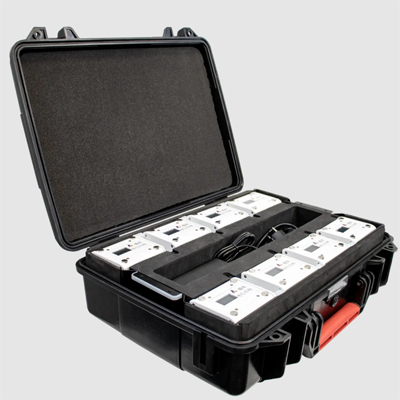 Mallette en plastique renforcé pour le transport de 8 PowerStations et leurs principaux accessoires. Sont inclus 8 TrackPins, 8 PowerStation Hangers, une alimentation 24VDC pour recharger les 8 PowerStations depuis le secteur et 8 câbles Bridge pour connecter ampoules 8 NYX Bulbs en simultanée.