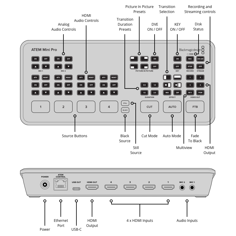 L’ATEM Mini Pro est très facile à installer et à utiliser. Il comprend quatre entrées HDMI standard, une sortie USB pour webcam, une sortie HDMI, un mixeur audio Fairlight avec EQ et dynamique, des DVE pour des effets d’image dans l’image, des transitions, un incrustateur chromatique sur fond vert, 20 images fixes pour les titres dans la bibliothèque de médias et le logiciel ATEM Software Control gratuit. L’ATEM Mini Pro permet aussi d’enregistrer directement sur des disques flash USB en H.264 et de faire du streaming en direct sur YouTube Live via le protocole Ethernet. Ce nouveau modèle possède également un multi view affichant 4 caméras, la prévisualisation, le programme, ainsi que l’état de l’enregistrement, du streaming et de l’audio.