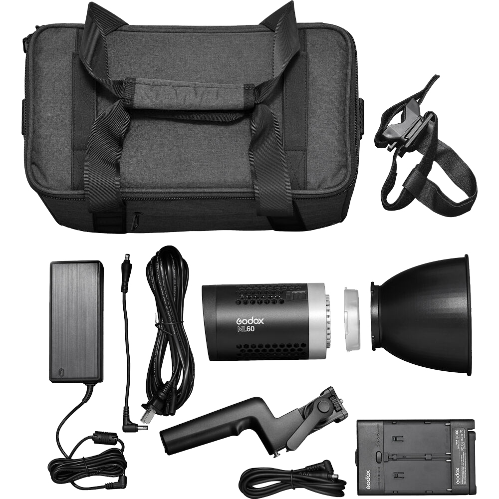 Contenu du kit : Lumière LED ML60, Prise, Boîtier de batterie BC60, Adapteur, Adaptateur Titulaire, Réflecteur, Couvercle de la lampe, Câble d'alimentation CA 5M, Câble d'alimentation CC de 1.5 M, Câble d'alimentation CC de 0.2 M, Attache, Agrafe, Mallette de transport